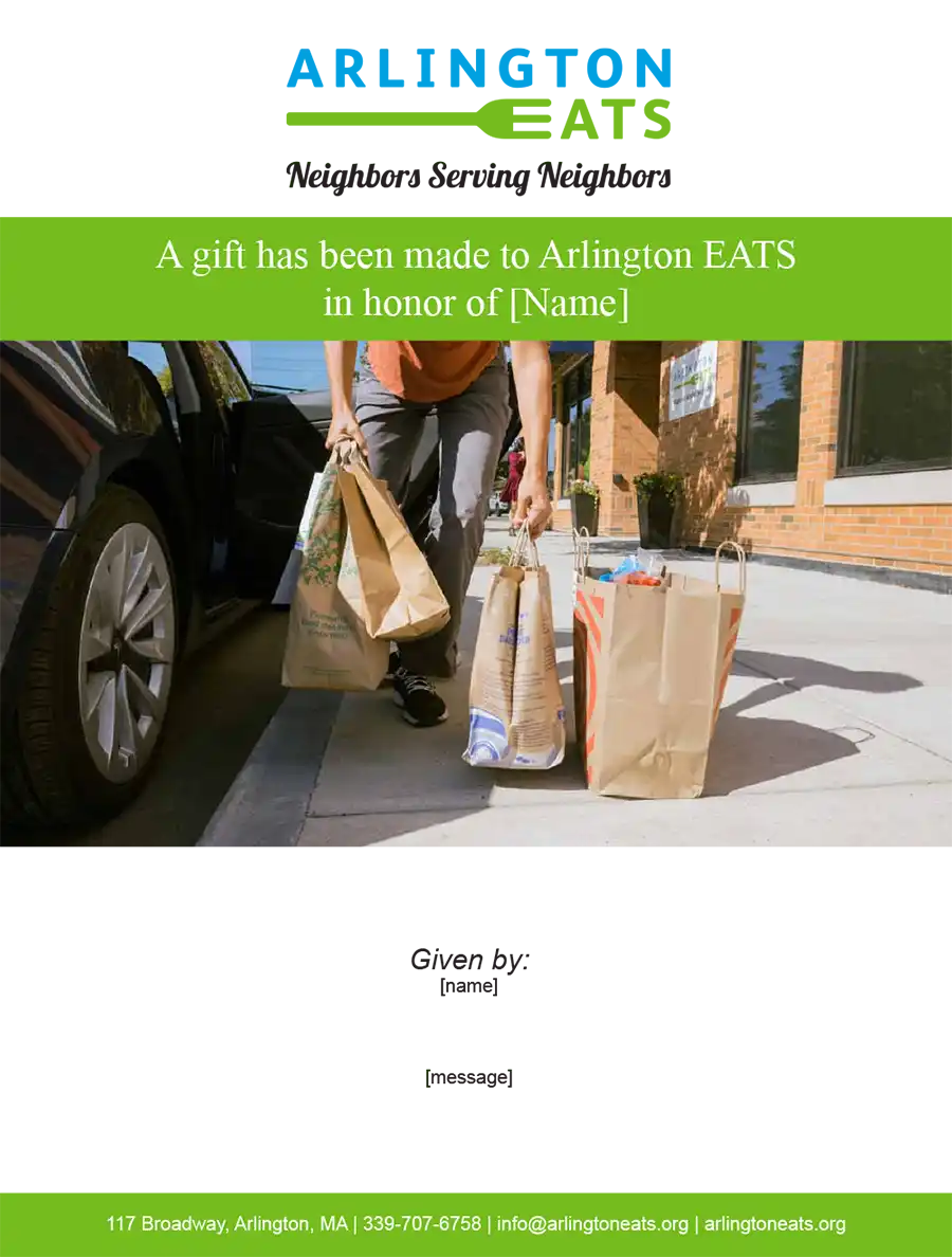 If you prefer to donate by check, please make it out to Arlington EATS and mail it to us at 117 Broadway, Suite A, Arlington, MA 02474. Thank you!